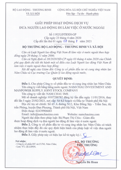 NAM CHAU IMS Company is an enterprise licensed by the Ministry of Labor, Invalids and Social Affairs of Vietnam to send Vietnamese workers to work abroad under contracts. With 20 years of experience, we can provide workers with different industry groups in large quantities according to the needs of partners. Besides providing all kinds of occupations under the category of Technicians, engineers, workers, skilled workers, agriculture, forestry and fishery, gardeners, unskilled workers, etc.